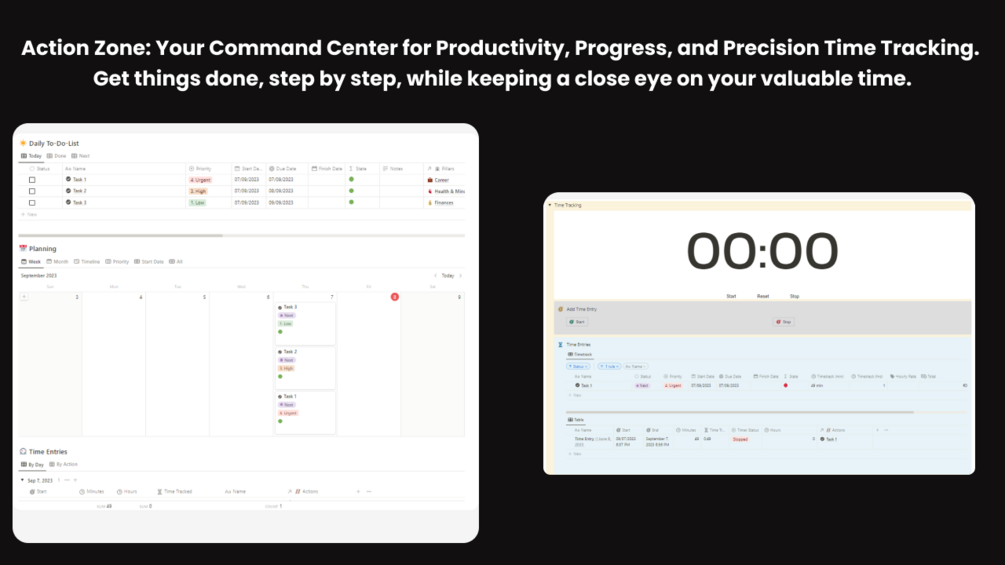 'The System' ensures you're aligned with your values and purpose. In the Action Zone, manage your to-do list, plan your day, track time entries, and oversee your projects. Meanwhile, the Alignment Zone lets you reflect on your guiding principles, core values, purpose, and why you do what you do. Regular reviews help you mark accomplishments and learn from any setbacks.