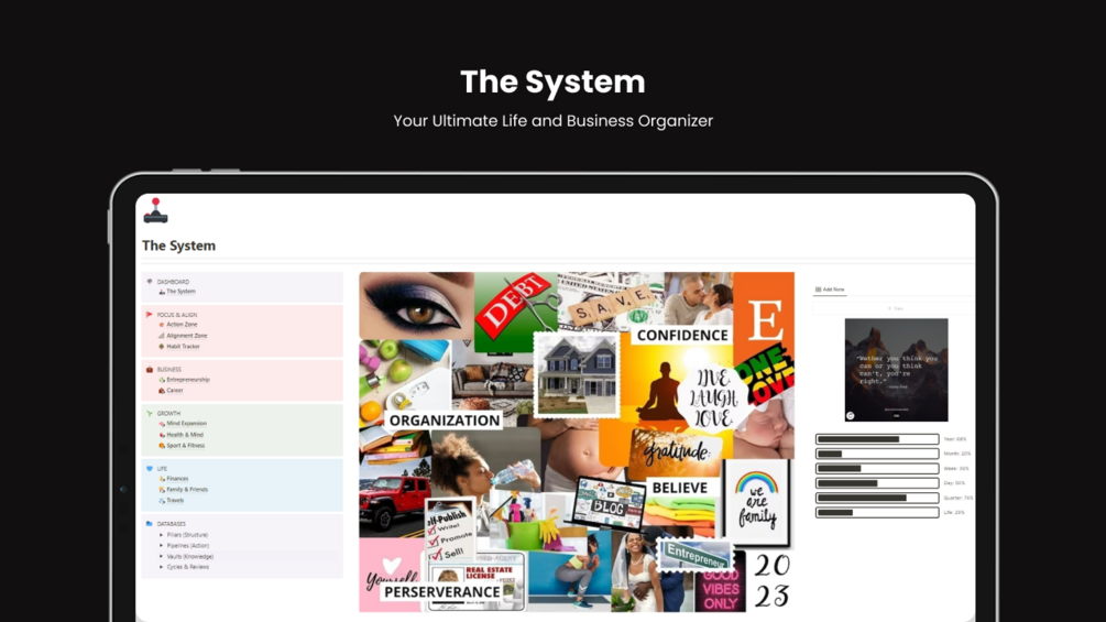 Unlock your potential, streamline your life, and elevate your business with 'The System.' It's more than a template; it's your partner in success.
